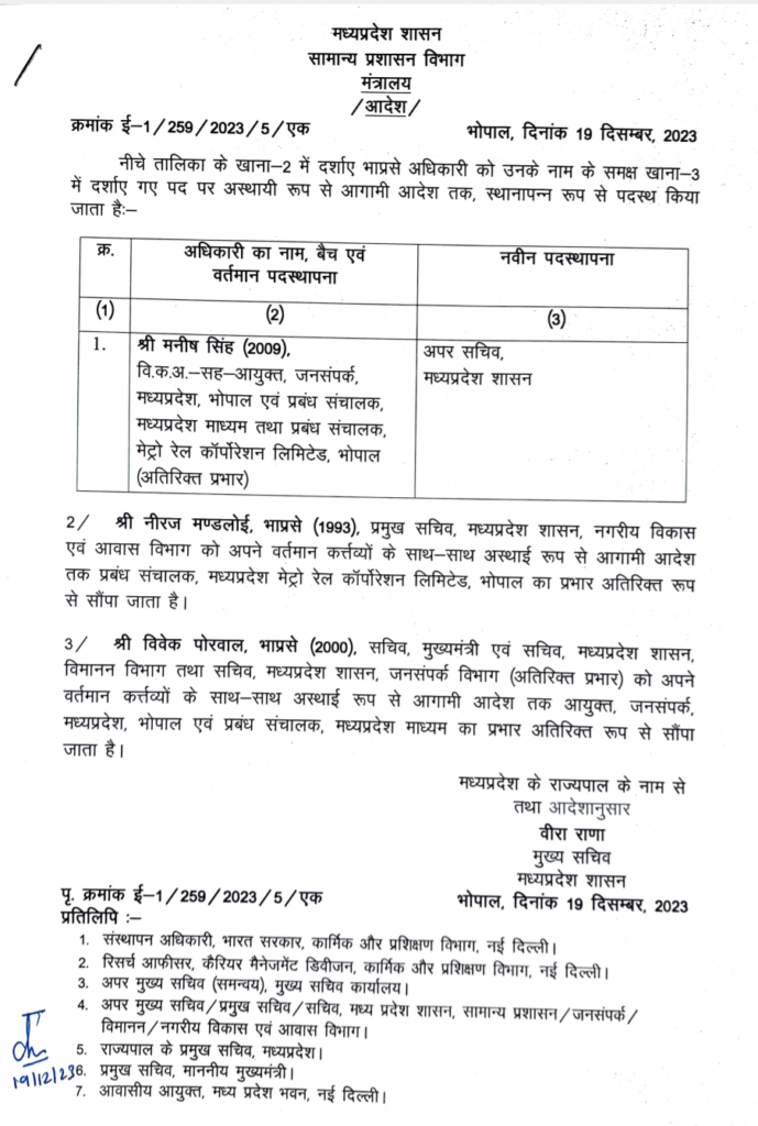 नीरज मंडलोई भाप्रेसे को वर्तमान कार्यो के साथ मेट्रो रेल कारपोरेशन की जिम्मेदारी विवेक पोरवाल भाप्रेसे को वर्तमान कार्यो के साथ जनसम्पर्क व अन्य जिम्मेदारी दी गई.