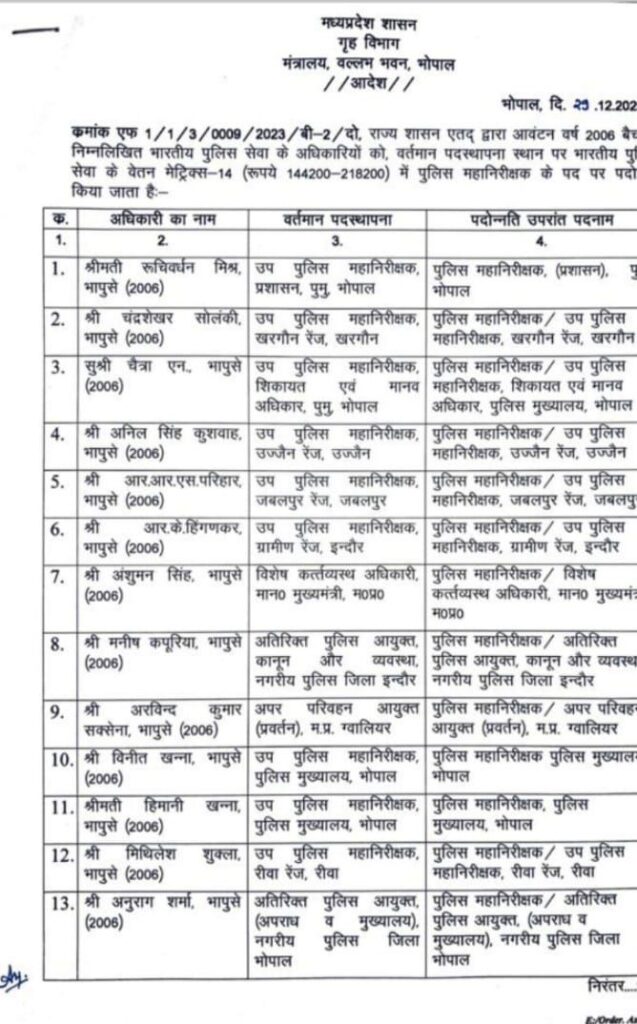मध्यप्रदेश IPS पुलिस प्रमोशन सूची जारी.