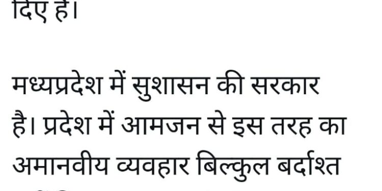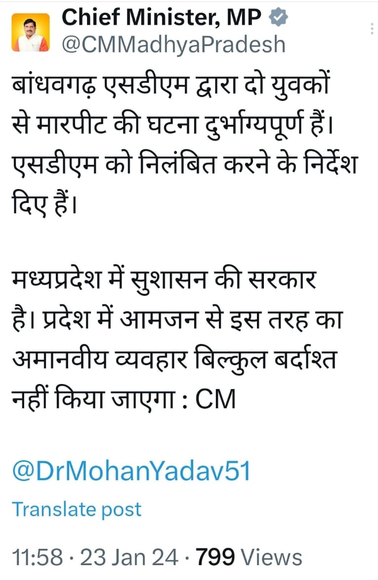 बांधवगढ़ एसडीएम द्वारा दो युवकों से मारपीट की घटना दुर्भाग्यपूर्ण हैं। एसडीएम को निलंबित करने के निर्देश दिए हैं। मध्यप्रदेश में सुशासन की सरकार है। प्रदेश में आमजन से इस तरह का अमानवीय व्यवहार बिल्कुल बर्दाश्त नहीं किया जाएगा : CM मोहन यादव!
