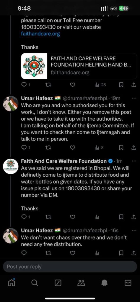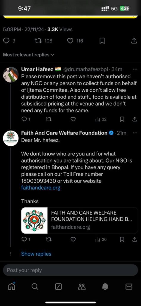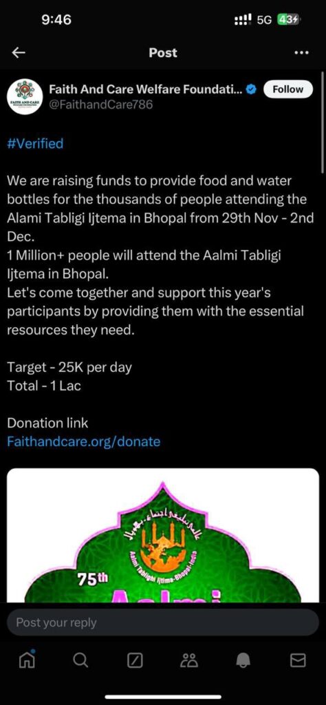 सोशल मीडिया प्लेटफार्म पर अशरफ हुसैन नामक एक व्यक्ति ने एक पोस्ट शेयर की। उन्होंने फेथ एंड केयर वेल्फेयर फाउंडेशन के नाम से एक अपील आगे बढ़ाई थी। इसमें कहा गया था कि आलमी तबलीगी इज्तिमा में आने वाले लाखों लोगों के लिए मुफ्त खाने और पानी की बॉटल का इंतजाम संस्था द्वारा किया जाएगा। इसके लिए उन्होंने चार दिन के इज्तिमा आयोजन में होने वाले खर्च के लिए लोगों से दान करने की अपील भी की।